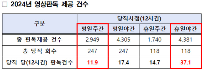 문제는 응급 영상판독을 12시간씩 1명의 당직의가 전담하고 있다는 점이다. 지난해 기준 평일 주간에는 1인당 평균 11.9건을 판독했지만, 휴일·야간에는 3배가 넘는 37.1건을 홀로 처리한 것으로 나타났다.