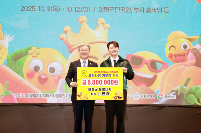 오태완 경남 의령군수(왼쪽)가 리치리치페스티벌 토요애 화합콘서트 무대에서 홍보 대사 위촉을 받은 가수 손빈아로부터 고향사랑기부금 500만원을 받고 있다. [사진=의령군] 2025.10.14