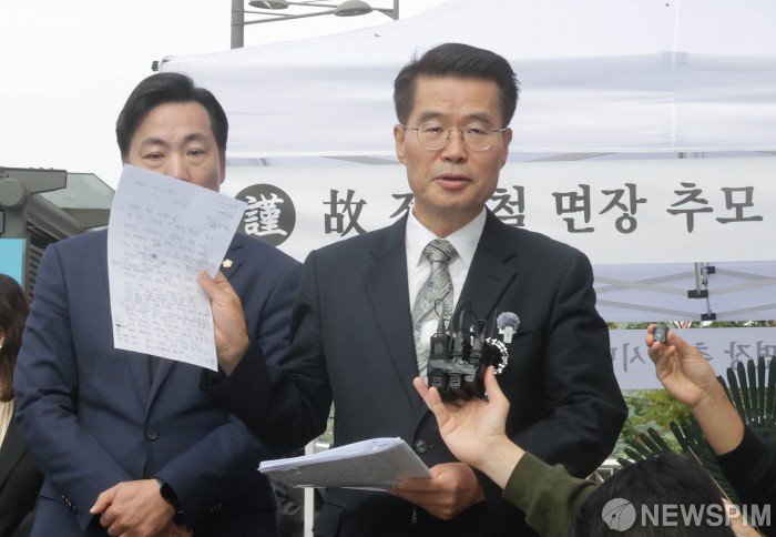[서울=뉴스핌] 양윤모 기자 = 양평군 공무원 정희철 면장 변호인인 박경호 변호사가 14일 오전 김건희 특검팀(특별검사 민중기) 사무실이 마련된 서울 광화문 KT웨스트빌딩 앞에서 정희철 면장 사망 사건에 관한 기자회견을 하고 있다. 2025.10.14 yym58@newspim.com
