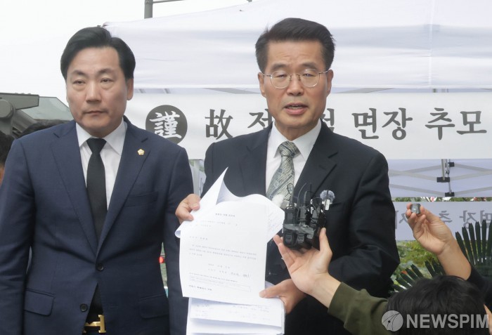 [서울=뉴스핌] 양윤모 기자 = 양평군 공무원 정희철 면장 변호인인 박경호 변호사가 14일 오전 김건희 특검팀(특별검사 민중기) 사무실이 마련된 서울 광화문 KT웨스트빌딩 앞에서 정희철 면장 사망 사건에 관한 기자회견을 하고 있다. 2025.10.14 yym58@newspim.com