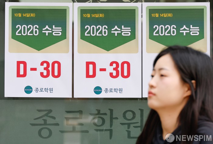 [서울=뉴스핌] 류기찬 기자 = 2026학년도 대학수학능력시험이 30일 앞으로 다가온 14일 오후 서울 마포구 종로학원 강북에 수능 D-30일 안내문이 붙어 있다, 이번 대학수학능력시험은 11월 13일에 치러진다. 2025.10.14 ryuchan0925@newspim.com