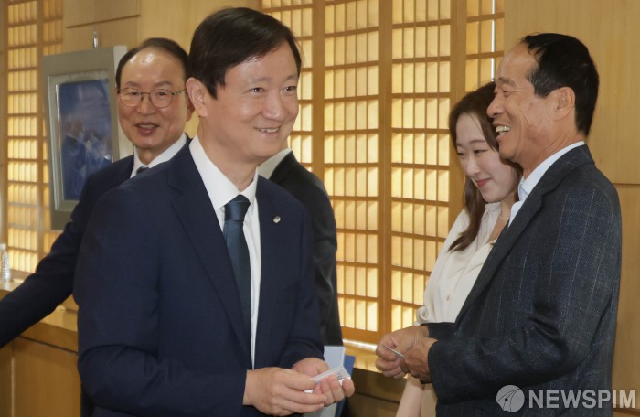 [서울=뉴스핌] 양윤모 기자 = 이찬진 금융감독원장이 14일 오후 서울 서대문구 한국공인회계사 회관에서 개최된 '금융감독원장-회계법인 최고경영자(CEO) 간담회'에 참석 명함을 교환후 환하게 웃고 있다. 이자리에는 최운열 한국공인회계사회 회장,윤훈수 삼일회계법인 대표이사,김교태 삼정회계법인 대표이사,박용근 한영회계법인 대표,홍종성 안진회계법인 대표 등 12개 회계법인 대표들이 참석했다. 2025.10.14 yym58@newspim.com