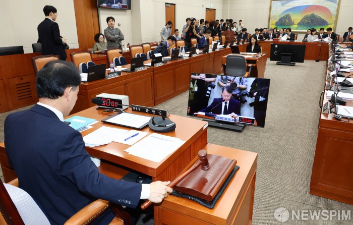 [서울=뉴스핌] 최지환 기자 = 윤한홍 국회 정무위원장이 14일 서울 여의도 국회에서 열린 공정거래위원회, 개인정보보호위원회 등 국정감사에서 의사봉을 두드리고 있다. 2025.10.14 choipix16@newspim.com