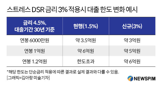 이를 반영하면 금리 4.2%, 30년 상환을 기준으로 할 때 연봉 6000만원 차주 한도는 약 3억5000만원에서 약 3억원으로 약 5000만원 가량 줄어들게 된다.