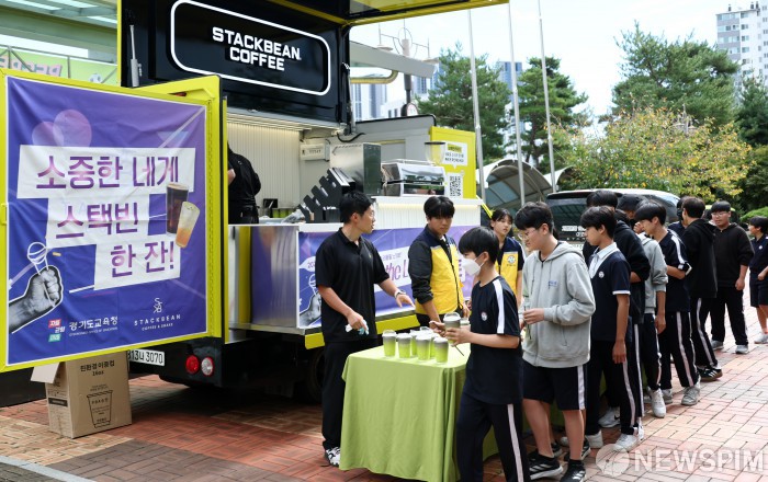 [파주=뉴스핌] 최지환 기자 = 한가람중학교 재학생들이 15일 오후 경기 파주시 한가람중학교에서 열린 '2025 경기도교육청 찾아가는 생명존중 캠페인'에서 스택빈이 후원한 커피차에서 음료를 받고 있다. 2025.10.15 choipix16@newspim.com