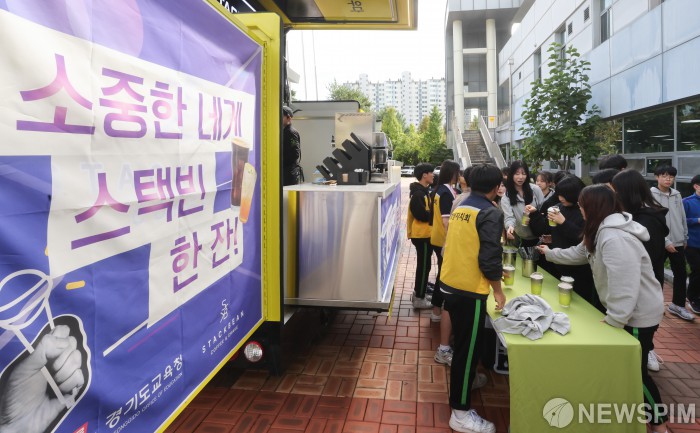 [파주=뉴스핌] 최지환 기자 = 한가람중학교 재학생들이 15일 오후 경기 파주시 한가람중학교에서 열린 '2025 경기도교육청 찾아가는 생명존중 캠페인'에서 스택빈이 후원한 커피차에서 음료를 받고 있다. 2025.10.15 choipix16@newspim.com