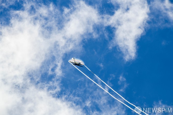 [서울=뉴스핌] 공군은 오는 10월 17일부터 19일까지 서울공항에서 서울 국제 항공우주 및 방위산업 전시회(ADEX) '퍼블릭 데이'를 개최한다. 사진은 15일, 퍼블릭데이를 앞두고 행사장 상공에서 시범비행 사전연습을 하고 있는 국산 첨단 전투기 KF-21 보라매. [사진=공군] 2025.10.15 photo@newspim.com