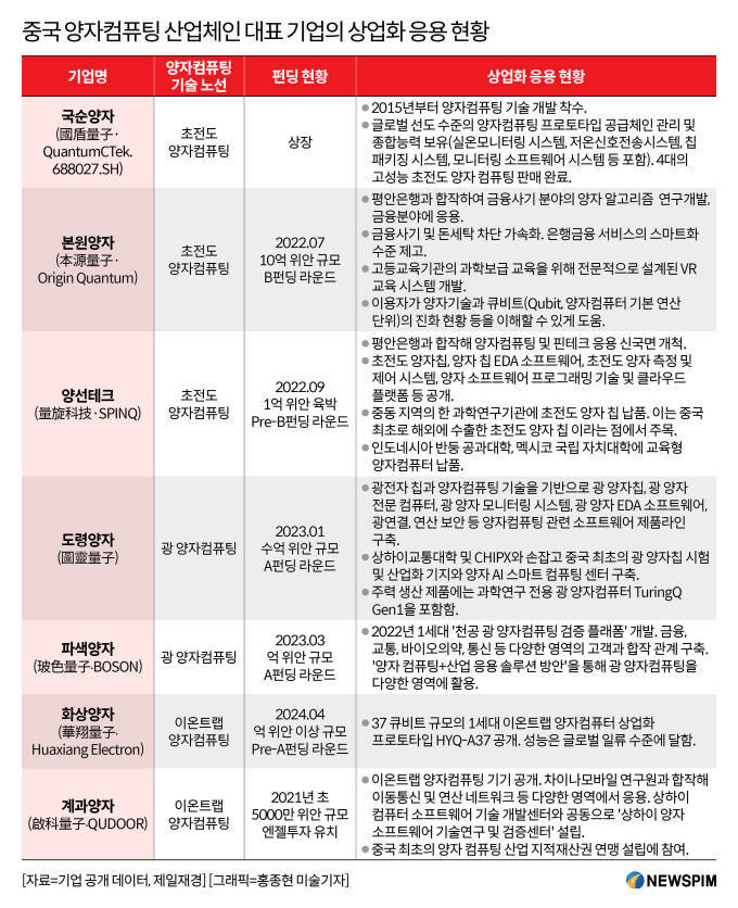 시장은 AI 업계의 다크호스로 급부상한 딥시크(DeepSeek∙深度求索∙선두추숴)와 같은 기업이 중국 양자 기술 산업에서 탄생할 수 있을 지 주목하고 있다. 아직까지는 양자 기술 산업 자체가 연구개발 초기 단계인 만큼 양자 기술, 그 중에서도 핵심 영역인 양자 컴퓨터와 관련한 기업은 많지 않다.