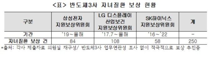 15일 국회 기후에너지환경노동위원회 소속 이학영 더불어민주당 의원이 삼성전자·LG디스플레이·SK하이닉스에서 받은 자료에 따르면 이들 3사가 자체 지원보상위원회를 통해 보상한 자녀산재 건수는 현재까지 250건으로 집계됐다.