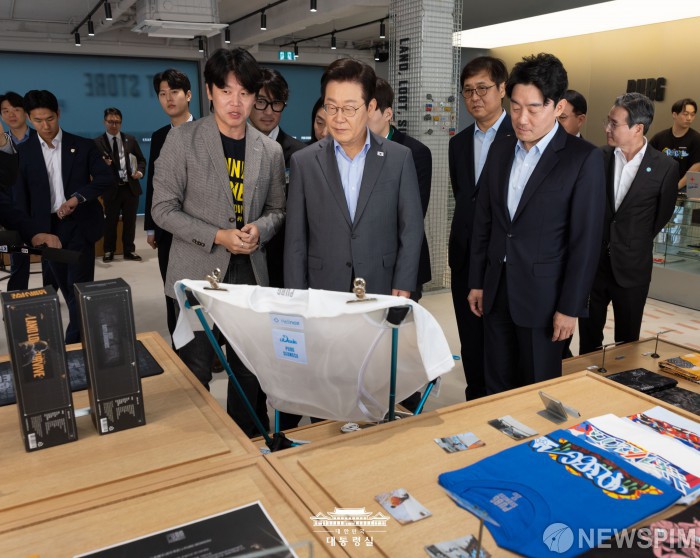 [서울=뉴스핌] 이재명 대통령이 15일 서울 성동구 펍지 성수에서 열린 K-게임 현장 간담회에서 게임 전시 공간을 둘러보고 있다. [사진=대통령실] 2025.10.15 photo@newspim.com