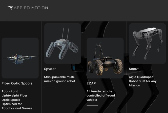 아페이로 모션의 지상 로봇 플랫폼은 극한 환경에서도 높은 신뢰성을 유지하며, 모듈식 페이로드 베이를 통해 신속한 임무 재구성이 가능하다. 주요 페이로드에는 ISR 센서 키트, 전술 도구, 물류 운반 장치, 광섬유 스풀이 포함되어 있다.