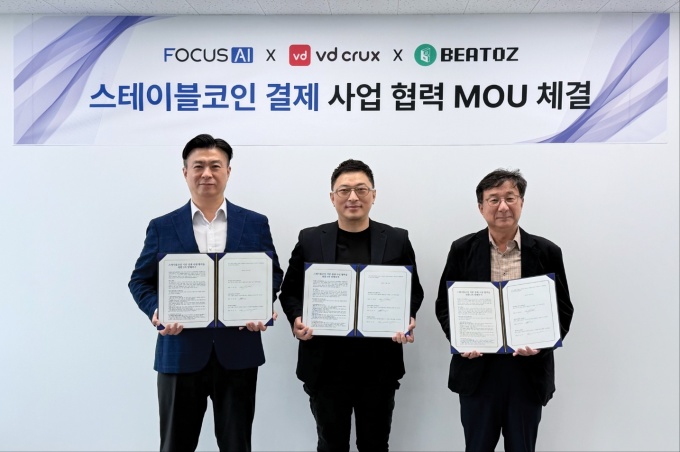 [서울=뉴스핌] 이나영 기자= 포커스에이아이는 브이디크럭스·비토즈와 블록체인 기반 스테이블코인 결제 솔루션 개발을 위한 3자 업무협약(MOU)를 체결했다고 16일 밝혔다.