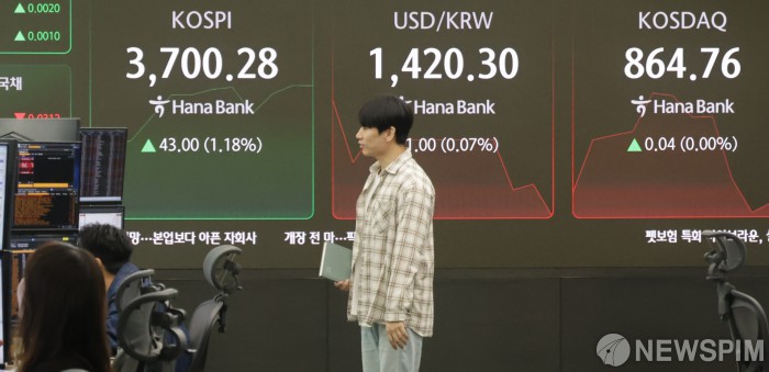 [서울=뉴스핌] 양윤모 기자 = 한미 무역협상의 최종 타결이 가시권에 들어온 가운데, 16일 오전 코스피가 전장 종가보다 43.00 포인트(1.18%) 상승하며 3700.28로, 코스닥은 0.04 포인트(0.00%) 상승한 864.76으로 장을 시작한 가운데, 서울 중구 하나은행 딜링룸에서 직원들이 업무를 보고 있다. 서울외환시장에서 달러/원 환율은 전장 대비 1.00원 하락한 1420.30원에 거래를 시작했다. 2025.10.16 yym58@newspim.com