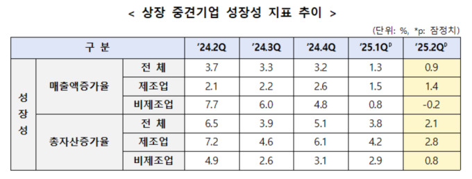 한국중견기업연합회가 16일 발표한 '2025년 2분기 상장 중견기업 경영 분석' 결과에 따르면, 상장 중견기업의 성장성 지표인 매출액증가율(0.9%)과 총자산증가율(2.1%)이 전년 동기 대비 각각 2.8%p(포인트), 4.4%p 하락한 것으로 집계됐다.