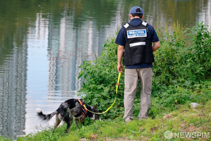 [의정부=뉴스핌] 류기찬 기자 = 한국인명구조견협회 관계자가 16일 오후 경기 의정부시 중랑천 일대에서 수색견과 함께 실종자 수색을 하고 있다. 앞서 지난 13일 오후 의정부시 중랑천에서 중학생 1명이 불어난 물에 휩쓸려 실종됐다. 2025.10.16 ryuchan0925@newspim.com