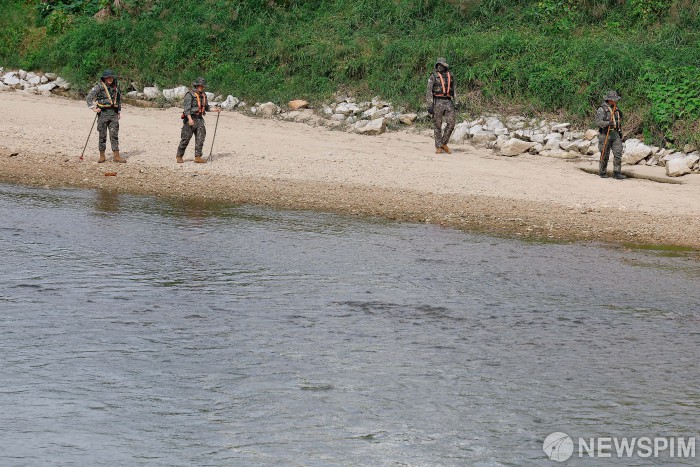 [의정부=뉴스핌] 류기찬 기자 = 군 관계자들이 16일 오후 경기 의정부시 중랑천 일대에서 실종자 수색을 하고 있다. 앞서 지난 13일 오후 의정부시 중랑천에서 중학생 1명이 불어난 물에 휩쓸려 실종됐다. 2025.10.16 ryuchan0925@newspim.com