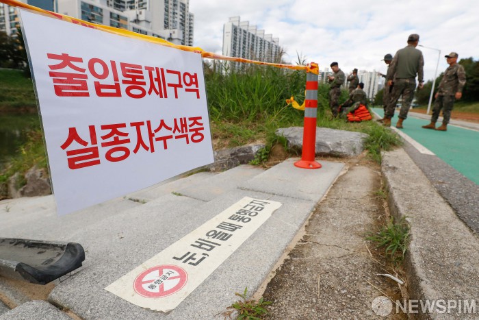 [의정부=뉴스핌] 류기찬 기자 = 군 관계자들이 16일 오후 경기 의정부시 중랑천 일대에서 실종자 수색을 하고 있다. 앞서 지난 13일 오후 의정부시 중랑천에서 중학생 1명이 불어난 물에 휩쓸려 실종됐다. 2025.10.16 ryuchan0925@newspim.com