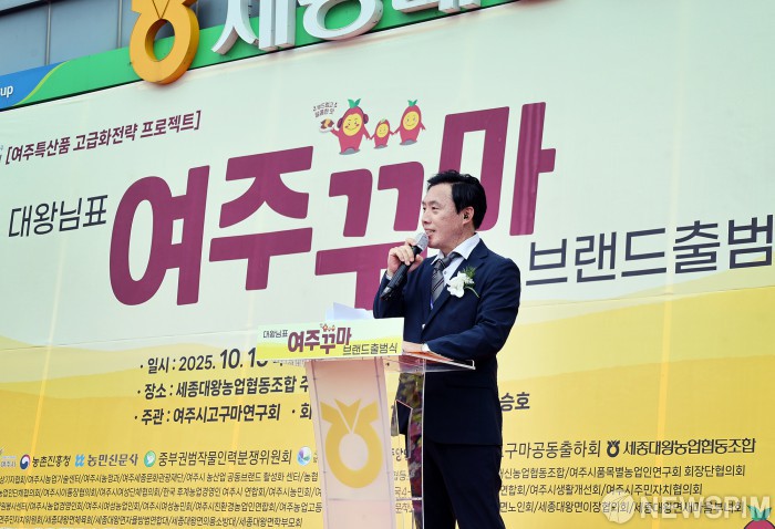 [서울=뉴스핌] 양윤모 기자 = 16일 오후 여주시고구마연구회(회장 이은규) 주최로 세종대왕농협에서 열린 ‘대왕님표 여주꾸마’ 브랜드 출범식에서 신승호 추진위원장이 인사말을 하고 있다. 이날 행사에는 이충우 여주시장, 김선교 국회의원, 박두형 여주시의회 의장, 시도의원 등 주요 내빈과 회원 400여명이 참석하였다. 여주시고구마연구회는 이번 출범식을 계기로 지역 대표 농산물인 여주고구마의 브랜드 가치 제고를 통해 전국시장 공략에 나섰다. [사진=여주시고구마연구회] 2025.10.16 yym58@newspim.com