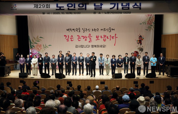 [서울=뉴스핌] 양윤모 기자 = 오승록 노원구청장이 16일 서울 노원구 노원구민의전당 대강당에서 열린 ‘제29회 노인의 날 기념행사’에 참석해 어르신들에게 감사 인사를 전하고 있다. [사진=노원구청] 2025.10.16 yym58@newspim.com