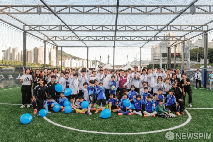 [서울=뉴스핌] 아디다스코리아가 서울시와 함께 ‘서울아 운동하자’ 사회공헌사업의 일환으로 동대문구 휘경2수변공원 풋살장을 새롭게 개보수했다고 17일 밝혔다. 재개장 기념식에서 아디다스코리아 마커스 모렌트 대표, 서울특별시체육회 정규혁 사무처장, 동대문구 이필형 구청장 비롯해 아디다스 임직원, 지역 어린이·장애인 축구팀이 참여해 기념 사진을 찍고 있다. [사진=아디다스코리아] 2025.10.17 photo@newspim.com