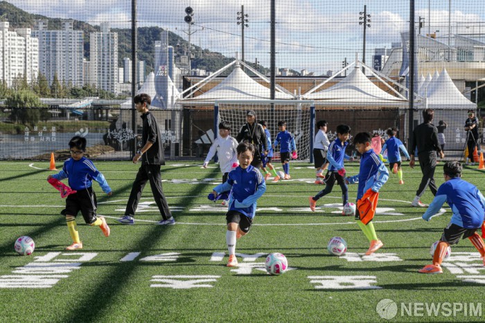 [서울=뉴스핌] 아디다스코리아가 서울시와 함께 ‘서울아 운동하자’ 사회공헌사업의 일환으로 동대문구 휘경2수변공원 풋살장을 새롭게 개보수했다고 17일 밝혔다. 재개장 기념식에서 아디다스코리아 마커스 모렌트 대표와 어린이·장애인 참가자들이 함께 풋살 클리닉을 진행하고 있다. 참가자들은 드리블과 패스 훈련을 배우며 팀워크를 다졌고, 아디다스는 스포츠를 통한 포용과 참여의 가치를 현장에서 구현했다. [사진=아디다스코리아] 2025.10.17 photo@newspim.com
