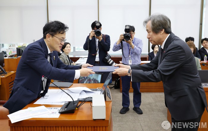 [서울=뉴스핌] 정일구 기자 = 정기석 국민건강보험공단 이사장이 17일 오전 서울 여의도 국회 보건복지위원회에서 열린 국민건강보험공단·건강보험심사평가원에 대한 국정감사에서 박주민 위원장에게 증인선서문을 전달하고 있다. 2025.10.16 mironj19@newspim.com