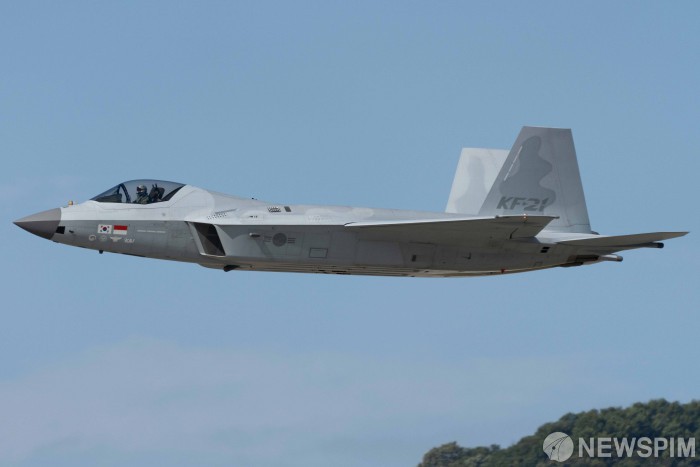 [성남=뉴스핌] 류기찬 기자 = 2025 서울 ADEX 개막일인 17일 오전 경기 성남시 서울공항에서 KF-21 보라매가 비행을 하고 있다. 2025.10.17 ryuchan0925@newspim.com