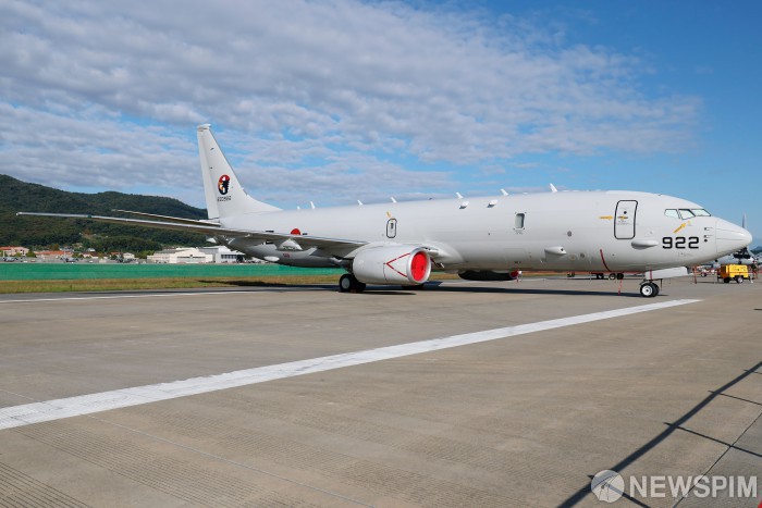 [성남=뉴스핌] 류기찬 기자 = 2025 서울 ADEX 개막일인 17일 오전 경기 성남시 서울공항에서 해군 P-8A 해상초계기가 전시되고 있다. 2025.10.17 ryuchan0925@newspim.com