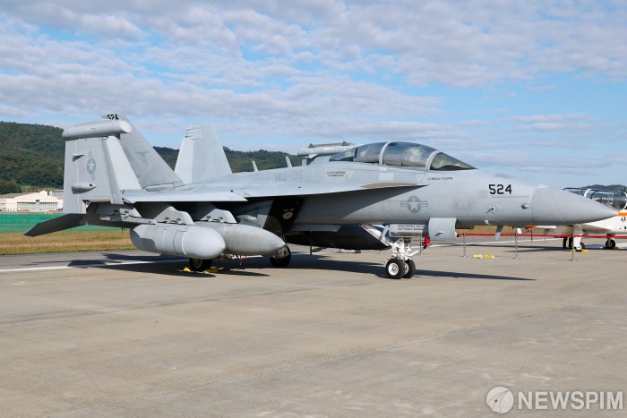 [성남=뉴스핌] 류기찬 기자 = 2025 서울 ADEX 개막일인 17일 오전 경기 성남시 서울공항에서 미 해군 EA-18G 그라울러가 전시되고 있다. 2025.10.17 ryuchan0925@newspim.com