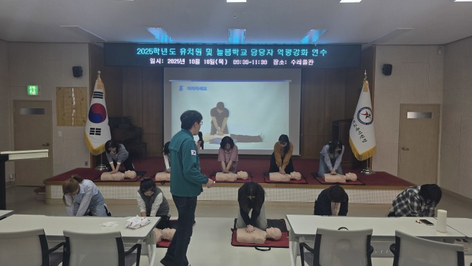 연수의 핵심 과정으로, 연천소방서 전문 강사를 초빙해 120분간 응급처치 및 심폐소생술 교육이 진행됐다. 참석자들은 응급상황 발생 시 대처를 위한 이론 교육과 함께 심폐소생술 실습에 직접 참여하며 위기대응 능력을 강화하는 실질적인 시간을 가졌다. 이 외에도 늘봄학교 사업에 대한 안내와 홍보가 이뤄졌다.