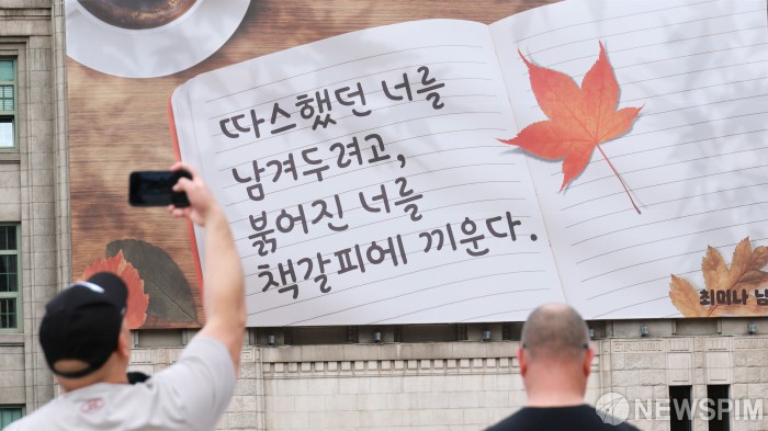 [서울=뉴스핌] 김학선 기자 = 17일 서울 중구 서울도서관 외벽 대형 글판인 서울꿈새김판이 가을을 맞아 '따스했던 너를 남겨두려고, 붉어진 너를 책갈피에 끼운다'라는 문구로 새 단장되어 있다. 2025.10.17 yooksa@newspim.com