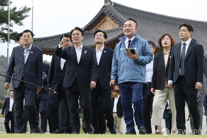 [서울=뉴스핌] 김민석 국무총리가 17일 경북 경주시 경주 예술의 전당을 찾아 APEC 경제인 행사 준비 현장을 점검하고 있다. [사진=총리실] 2025.10.17 photo@newspim.com
