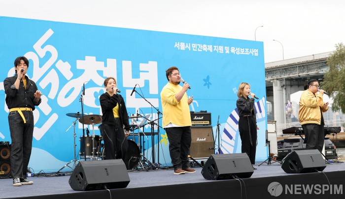 [서울=뉴스핌] 정일구 기자 = '히든스테이지 시즌3 TOP10' 나린이 18일 오후 서울 서초구 반포한강공원 세빛섬 야외무대에서 감엔터테인먼트 주최로 열린 '2025 한강 청년 버스킹 축제'에서 라이브 공연을 선보이고 있다. 2025.10.18 mironj19@newspim.com