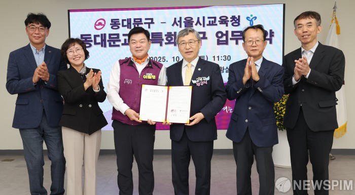 [서울=뉴스핌] 양윤모 기자 = 정근식 서울시교육감과 이필형 동대문구청장이 18일 오전 동대문구청에서 교육청·학교·지역사회가 함께 어린이와 청소년의 성장을 지원하는 지역 맞춤형 교육협력 모델인 ‘동대문교육협력특구’ 운영을 위한 업무협약을 체결후 기념촬영을 하고 있다. [사진=서울시교육청] 2025.10.18 yym58@newspim.com
