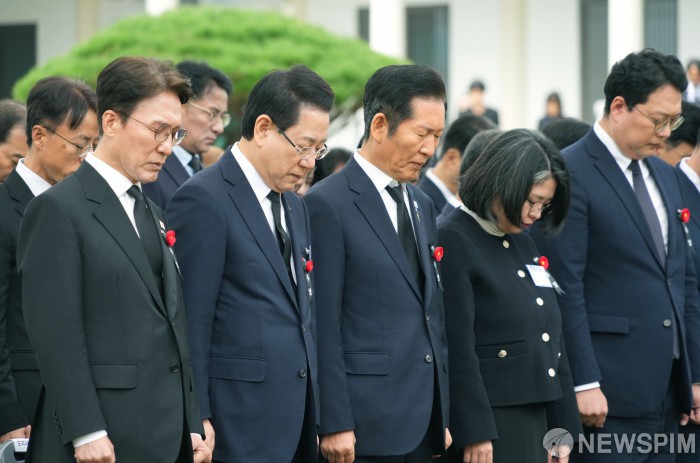 [무안=뉴스핌] 조은정 기자 = 김영록 전남도지사가 19일 구례군 지리산역사문화관에서 열린 '여순사건 제77주기 합동추념식' 행사에서 김민석 국무총리, 정청래 민주당대표 등 국회의원들과 희생자들에 대한 묵념을 하고 있다. [사진=전남도] 2025.10.19 ej7648@newspim.com