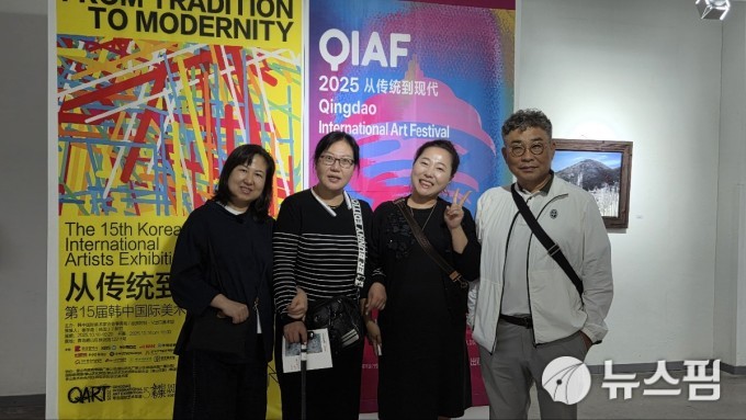 [중국=뉴스핌] 남경문 기자 = 15회 한중국제미술가전이 '전통에서 현대까지(From Tradition to Modernity)'를 주제로 중국 칭다오에서 열렸다. 왼쪽부터 이선영·박경희·이진숙·김종호 작가 2025.10.19 |