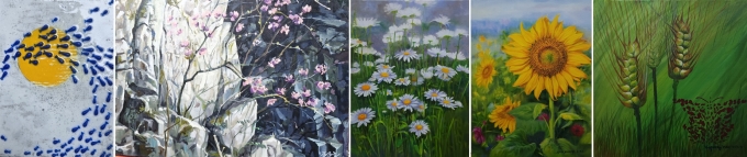 왼쪽부터 이진숙 작가의 '바닷속에 들어 온 달' 김종호 작가의 '봄 소식', 김양수 작가의 '실상의 고요를 행복으로', 이선영 작가의 해바라기, 박경희 작가의 '한 여름날의 꿈' 작품 [사진=독자제공] 2025.10.19 |