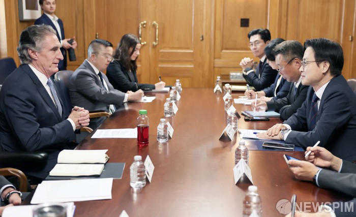 김정관 산업통상부 장관이 지난 17일(현지시간) 미국 워싱턴 D.C. 내무부에서 더그 버검(Doug Burgum) 미국 백악관 국가에너지위원회 위원장 겸 내무부 장관과 면담을 갖고, LNG 등 한-미 양국 간 에너지 협력 방안을 논의했다.