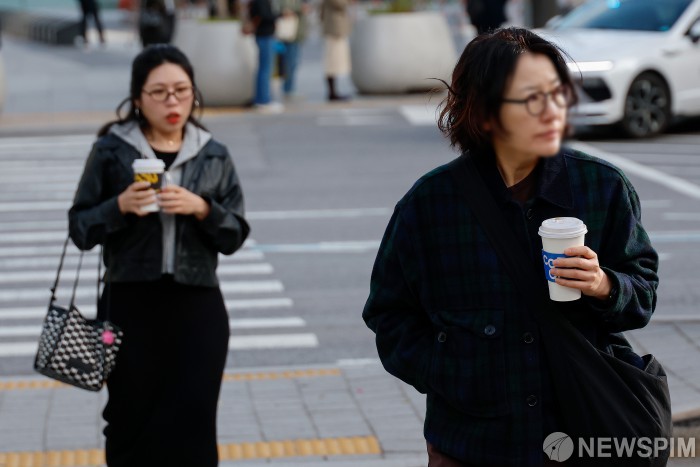 [서울=뉴스핌] 류기찬 기자 = 전국 대부분 지역의 아침 최저 기온이 한 자릿수를 기록한 20일 오전 서울 종로구 광화문광장에서 두꺼운 외투를 입은 시민들이 출근길 발걸음을 재촉하고 있다. 2025.10.20 ryuchan0925@newspim.com