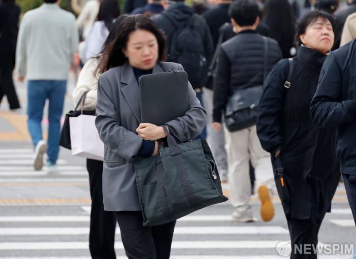 [서울=뉴스핌] 류기찬 기자 = 전국 대부분 지역의 아침 최저 기온이 한 자릿수를 기록한 20일 오전 서울 종로구 광화문광장에서 두꺼운 외투를 입은 시민들이 출근길 발걸음을 재촉하고 있다. 2025.10.20 ryuchan0925@newspim.com