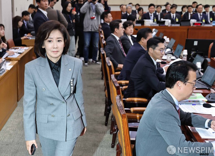 [서울=뉴스핌] 윤창빈 기자 = 나경원 국민의힘 의원이 20일 오전 서울 여의도 국회에서 법제사법위원회의 서울고등법원 등에 대한 국정감사에서 신상발언을 마치고 회의장을 나서고 있다. 2025.10.20 pangbin@newspim.com