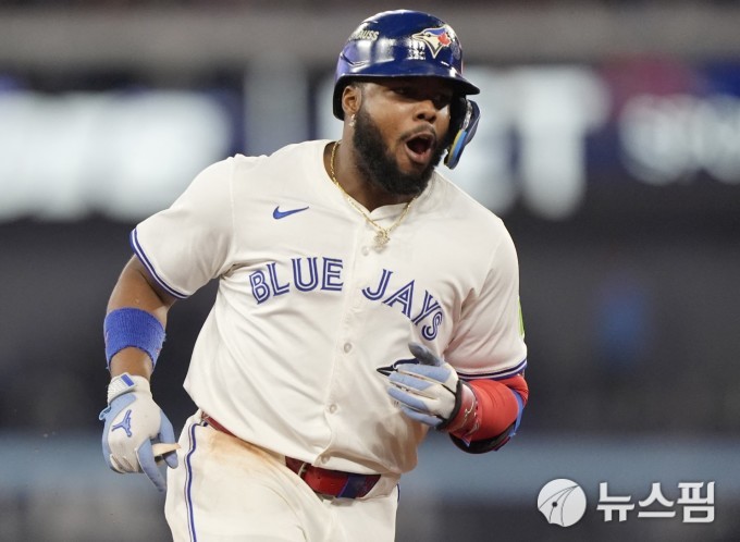 [토론토=뉴스핌] 박상욱 기자= 블라디미르 게레로 주니어가 20일(한국시간) MLB 아메리칸리그 챔피언십시리즈 6차전 5회 솔로 홈런을 때리고 주루하고 있다. 2025.10.20 psoq1337@newspim.com |