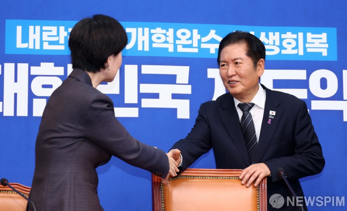 [서울=뉴스핌] 최지환 기자 = 정청래 더불어민주당 대표가 20일 오후 서울 여의도 국회에서 사법개혁특별위원회 사법개혁안 발표를 앞두고 백혜련 사법개혁특별위원회 위원장과 악수하고 있다. 2025.10.20 choipix16@newspim.com