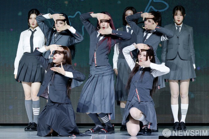 [서울=뉴스핌] 류기찬 기자 = 걸그룹 하츠투하츠(Hearts2Hearts)가 20일 오후 서울 용산구 블루스퀘어 SOL트래블홀에서 열린 첫 미니앨범 ‘FOCUS' 발매 기념 미디어 쇼케이스에서 타이틀 곡인 'FOCUS' 무대를 선보이고 있다. 타이틀 곡 'FOCUS'는 빈티지한 피아노 리프가 돋보이는 하우스 장르 기반의 곡으로, 중독성 강한 멜로디와 시크한 보컬이 어우러져 하츠투하츠의 새로운 매력을 선사한 곡이다. 2025.10.20 ryuchan0925@newspim.com