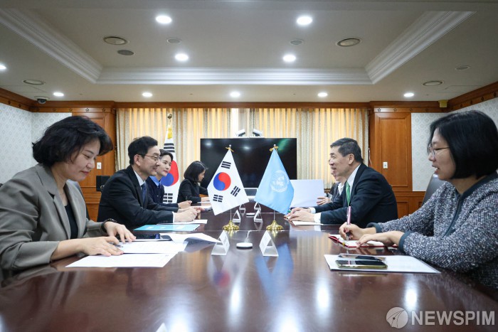 [서울=뉴스핌] 이길동 기자 = 윤창렬 국무조정실장이 20일 서울 종로구 정부서울청사에서 하오량 쉬 유엔개발계획(UNDP) 총재대행을 접견하고 있다.[사진=총리실] 2025.10.20 photo@newspim.com
