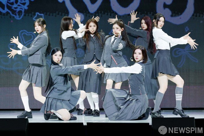 [서울=뉴스핌] 류기찬 기자 = 걸그룹 하츠투하츠(Hearts2Hearts)가 20일 오후 서울 용산구 블루스퀘어 SOL트래블홀에서 열린 첫 미니앨범 ‘FOCUS' 발매 기념 미디어 쇼케이스에서 타이틀 곡인 'FOCUS' 무대를 선보이고 있다. 타이틀 곡 'FOCUS'는 빈티지한 피아노 리프가 돋보이는 하우스 장르 기반의 곡으로, 중독성 강한 멜로디와 시크한 보컬이 어우러져 하츠투하츠의 새로운 매력을 선사한 곡이다. 2025.10.20 ryuchan0925@newspim.com