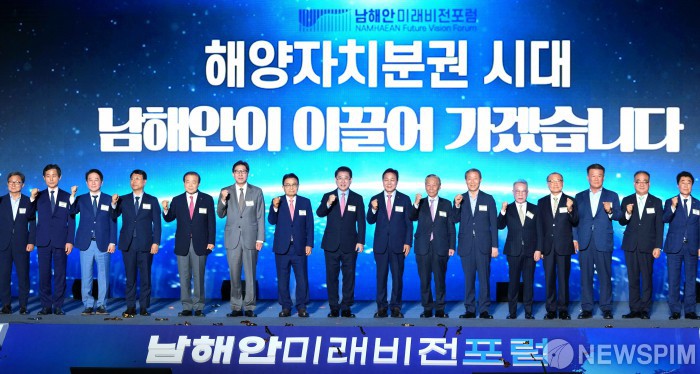 [무안=뉴스핌] 조은정 기자 = 김영록 전남도지사가 20일 부산 벡스코 컨벤션홀에서 열린 '2025 남해안 미래비전 포럼'에 참석해 박형준 부산시장, 박완수 경남도지사 등 주요 내·외빈들과 기념촬영을 하고 있다. [사진=전남도] 2025.10.19 ej7648@newspim.com