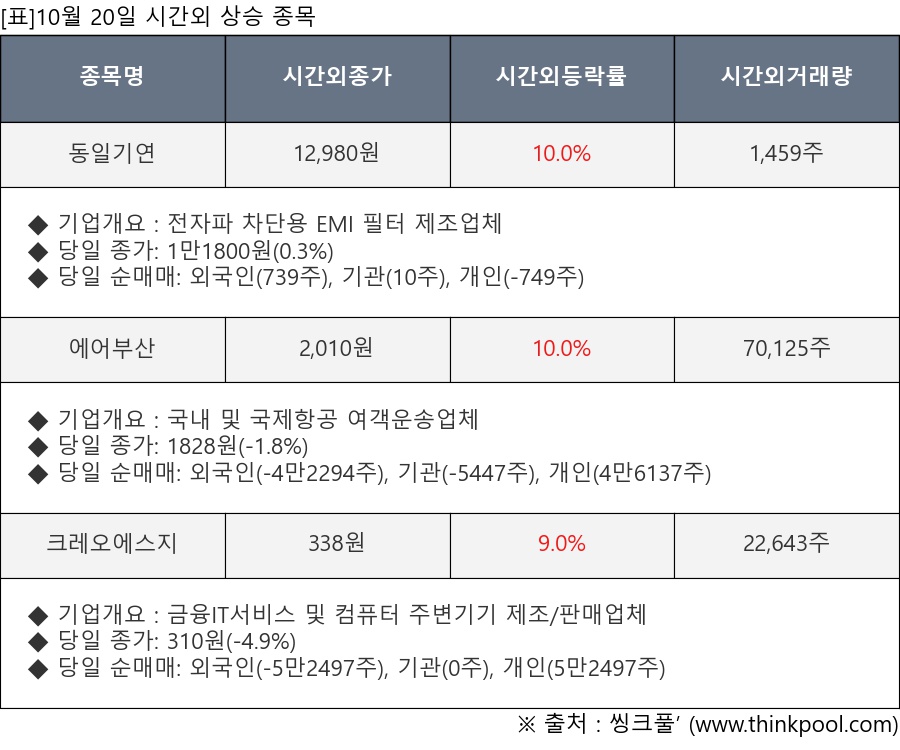 [서울=뉴스핌] 로보뉴스 = 10월 20일, 인공지능 투자비서 ‘AI라씨로’가 동일기연(032960), 에어부산(298690) 등 시간외 단일가 매매 상승률 상위 종목들에 대한 최근 동향을 분석했다.