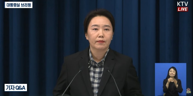 강유정 대통령실 대변인이 20일 저녁 캄보디아 사태와 관련한 후속 조치에 대해 언론 브리핑을 하고 있다. [사진=KTV] |