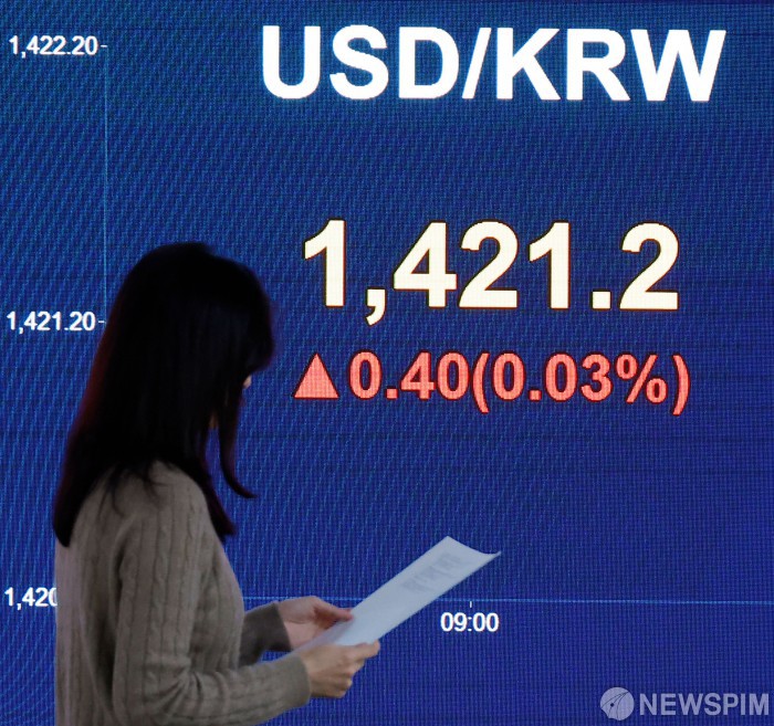 [서울=뉴스핌] 류기찬 기자 = 21일 오전 서울 여의도 KB국민은행 딜링룸 전광판에 달러/원 지수가 표시되고 있다. 이날 코스피 지수는 전장 대비 36.32포인트(0.95%) 오른 3851.01에, 코스닥 지수는 5.76포인트(0.66%) 오른 881.53에 장을 시작했다. 달러/원 환율은 전장보다 1.80원 오른 1421.00으로 출발했다. 2025.10.21 ryuchan0925@newspim.com